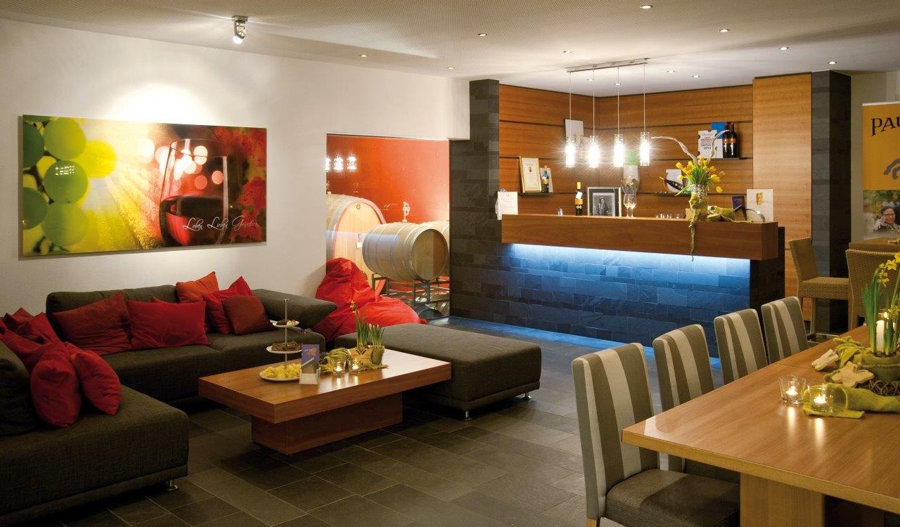 Staal, glas, hout en steen - Pauser's kwartier, dat is een nobele sfeer. Het uitzicht vanaf het terras over de wijngaarden is overweldigend, net als de sfeer in de barrique store of in de grote balzaal.
