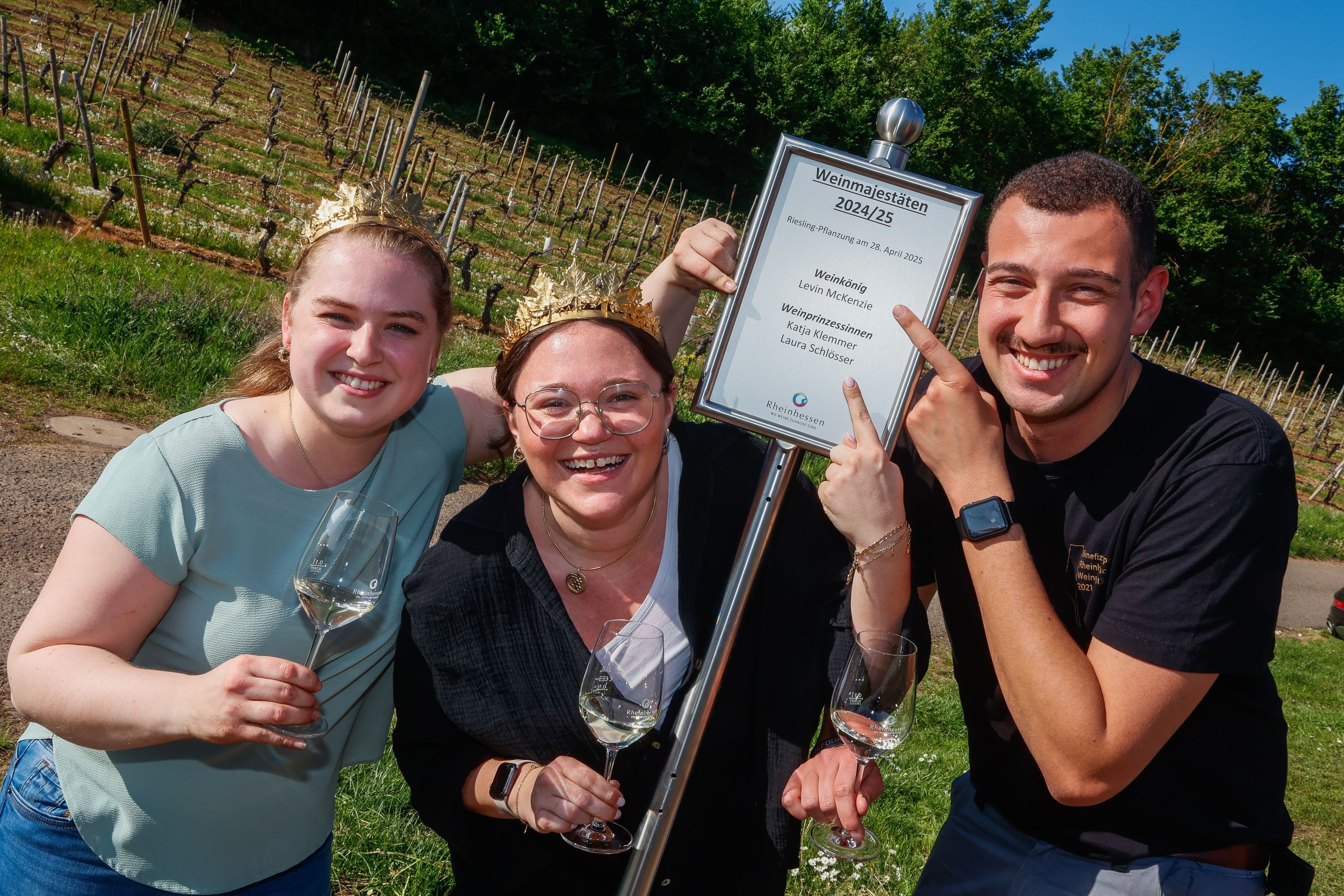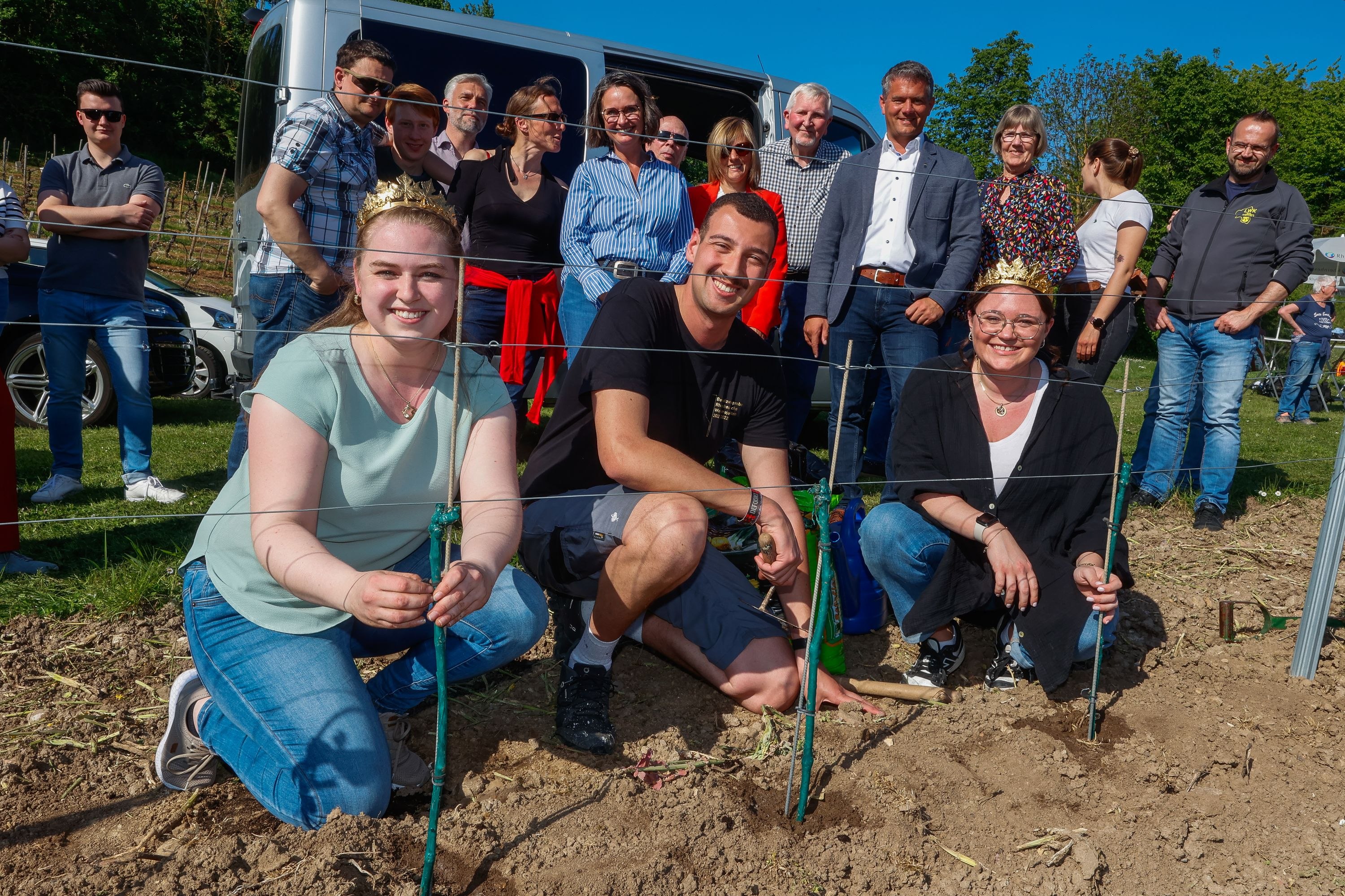Mit fachkundiger Unterstützung der Winzer Klaus Marx und Wolfgang Born setzten der Rheinhessische Weinkönig Levin McKenzie und die Rheinhessischen Weinprinzessinnen Katja Klemmer und Laura Schlösser bei der diesjährigen Pflanzung in diesem exponierten Weinberg die jungen Rieslingreben.