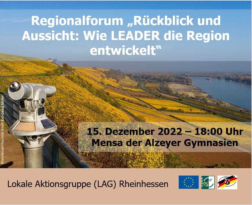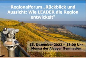 Gerne möchten wir den Moment nutzen, um die letzten Jahre Revue passieren zu lassen und spannende Einblicke in die Zukunft und die Neuausrichtung zu bekommen. Darum laden wir Sie herzlich ein zum Regionalforum „Rückblick und Aussicht: Wie LEADER die Region entwickelt“ der LAG Rheinhessen am