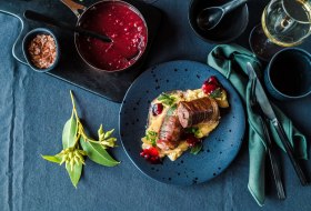 Dieses Gericht ist ein wahrer Gaumenschmaus und Hingucker. Schön ist jedoch, dass man für diesen besonderen Gang nicht lange in der Küche stehen muss, denn der Rehrücken braucht nur eine kurze Zubereitungszeit und muss nicht lange in der Pfanne angebraten werden. Der Mantel aus Schinken und Salbei schützt das so zarte Wildfleisch, verleiht ihm aber gleichzeitig ein wunderbares Aroma. Und auch die Preiselbeerjus ist im Handumdrehen auf dem Teller und eben eine schöne Alternative zu einer klassischen Jus die sonst über Stunden eingekocht werden muss.