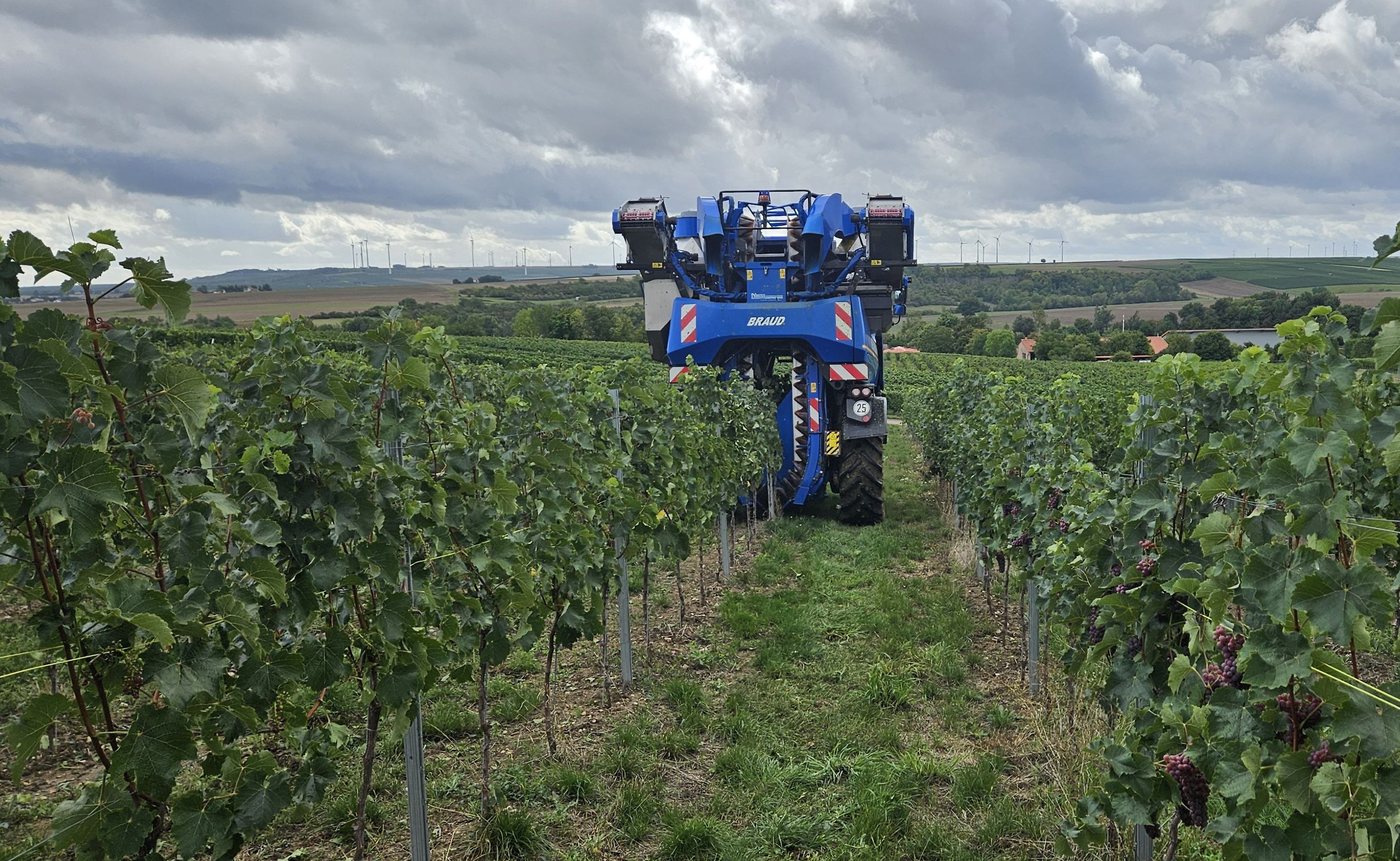 Die Traubenvollernter können mit ihrer Schlagkraft große Flächen recht schnell abernten und die geringen Erträge verstärken diesen Geschwindigkeitsfaktor in der Lese zusätzlich. Die Winzerinnen und Winzer müssen durch die geringeren Erträge deutlich mehr Weinbergzeilen lesen, um ihre Kelter genauso voll zu bekommen wie im Vorjahr. Wer aktuell mit der Hand liest, muss sorgsam selektieren und kann damit noch immer herausragende Qualitäten nachhause fahren.