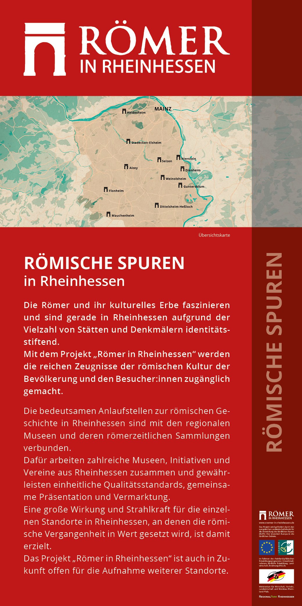 Die Römer und ihr kulturelles Erbe faszinieren viele Menschen und besitzen auch und gerade in Rheinhessen eine starke identitätsstiftende Kraft. Mit dem Vorhaben „Römer in Rheinhessen“ sollen die reichen Zeugnisse der römischen Kultur in Rheinhessen durch eine Vernetzung und Erschließung von Bodendenkmälern und archäologischen Funden der Bevölkerung zugänglich gemacht werden. Die Vermittlung soll über Flyer mit Landkarte und Beschreibung der Teilziele sowie eine Internetpräsentation und einheitlich konzipierte und gestaltete Informationstafeln an Ort und Stelle erfolgen. Zusätzlich wird ein Film zum Thema „Römer in Rheinhessen“ erstellt.