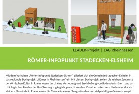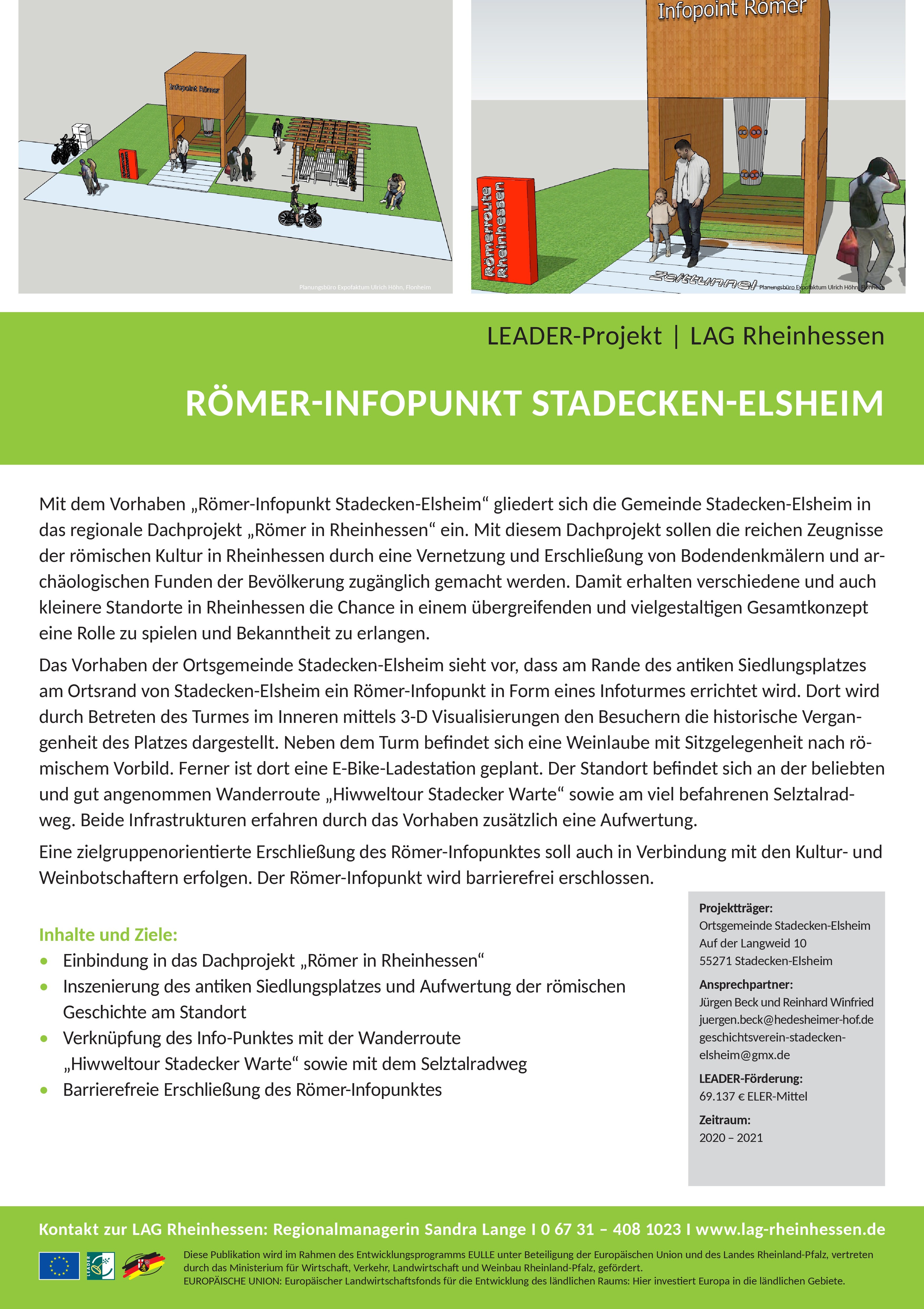Das Vorhaben der Ortsgemeinde Stadecken-Elsheim sieht vor, dass am Rande des antiken Siedlungsplatzes am Ortsrand von Stadecken-Elsheim ein Römer-Infopunkt in Form eines Infoturmes errichtet wird. Dort wird durch Betreten des Turmes im Inneren mittels 3 D Visualisierungen den Besuchern die historische Vergangenheit des Platzes dargestellt. Neben dem Turm befindet sich eine Weinlaube mit Sitzgelegenheit nach römischem Vorbild. Ferner ist dort eine E-Bike-Ladestation geplant. Der Standort befindet sich an der beliebten und gut angenommen Wanderroute „Hiwweltour Stadecker Warte“ sowie am viel befahrenen Selztalradweg. Beide Infrastrukturen erfahren durch das Vorhaben zusätzlich eine Aufwertung.