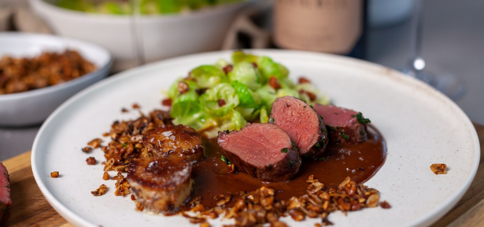 - Fleisch aus der Pfanne nehmen, in Alufolie wickeln und im restwarmen Ofen auf eine Kerntemperatur von 57 °C ziehen lassen.