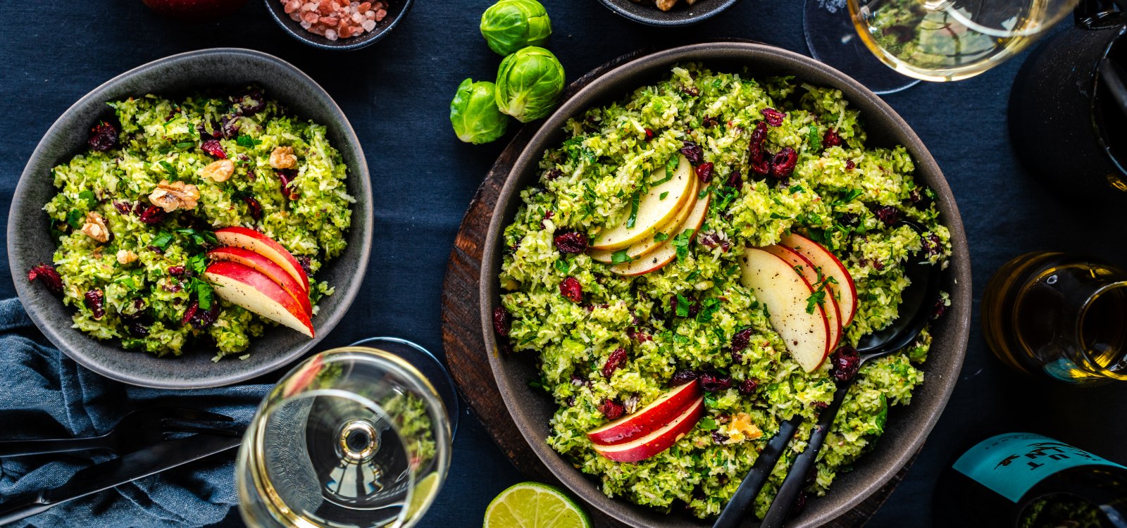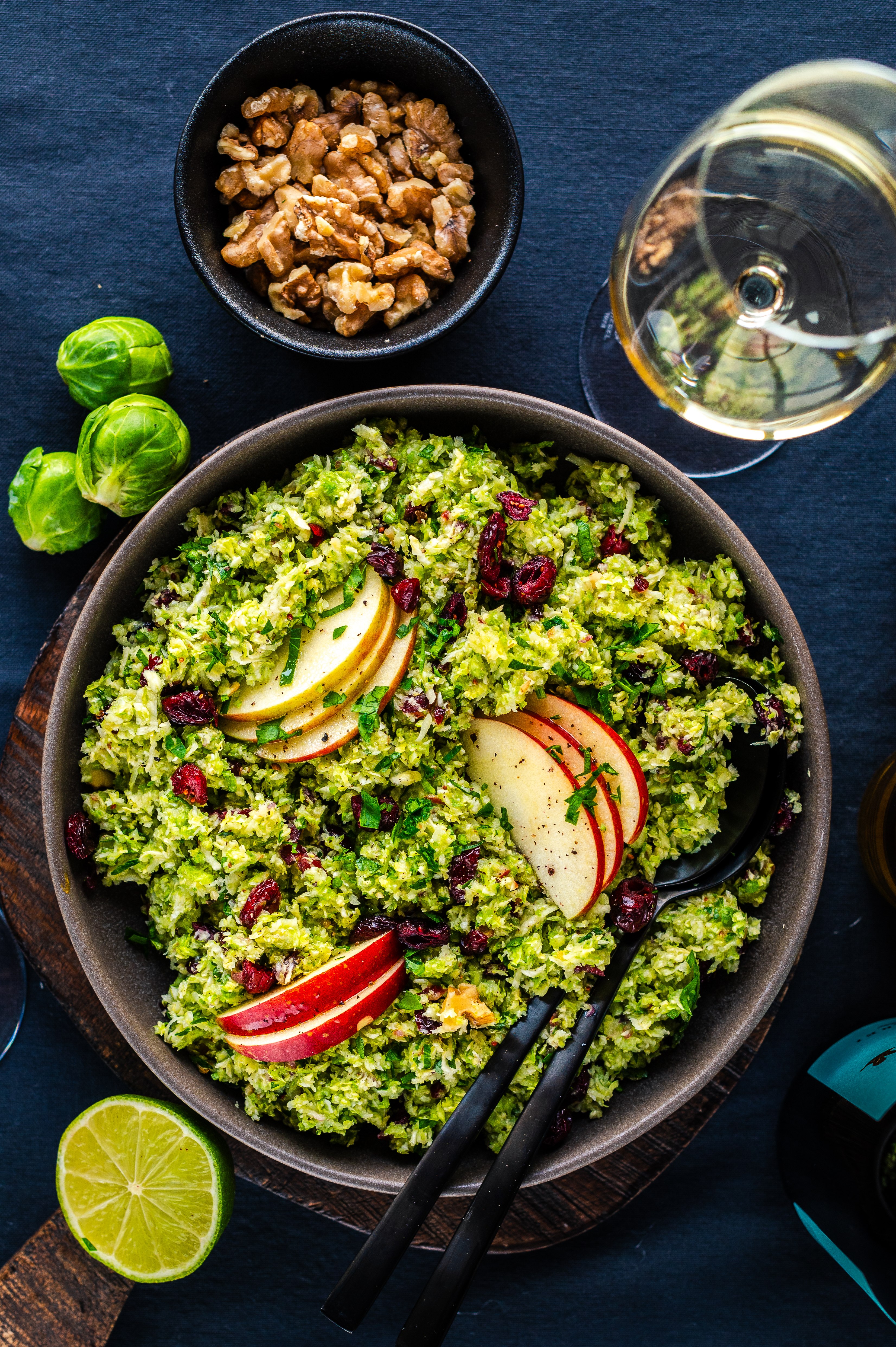 Da kommt dieser Rohkostsalat aus Rosenkohl, Äpfeln, Zwiebeln und würzigen Walnüssen doch wie gerufen!