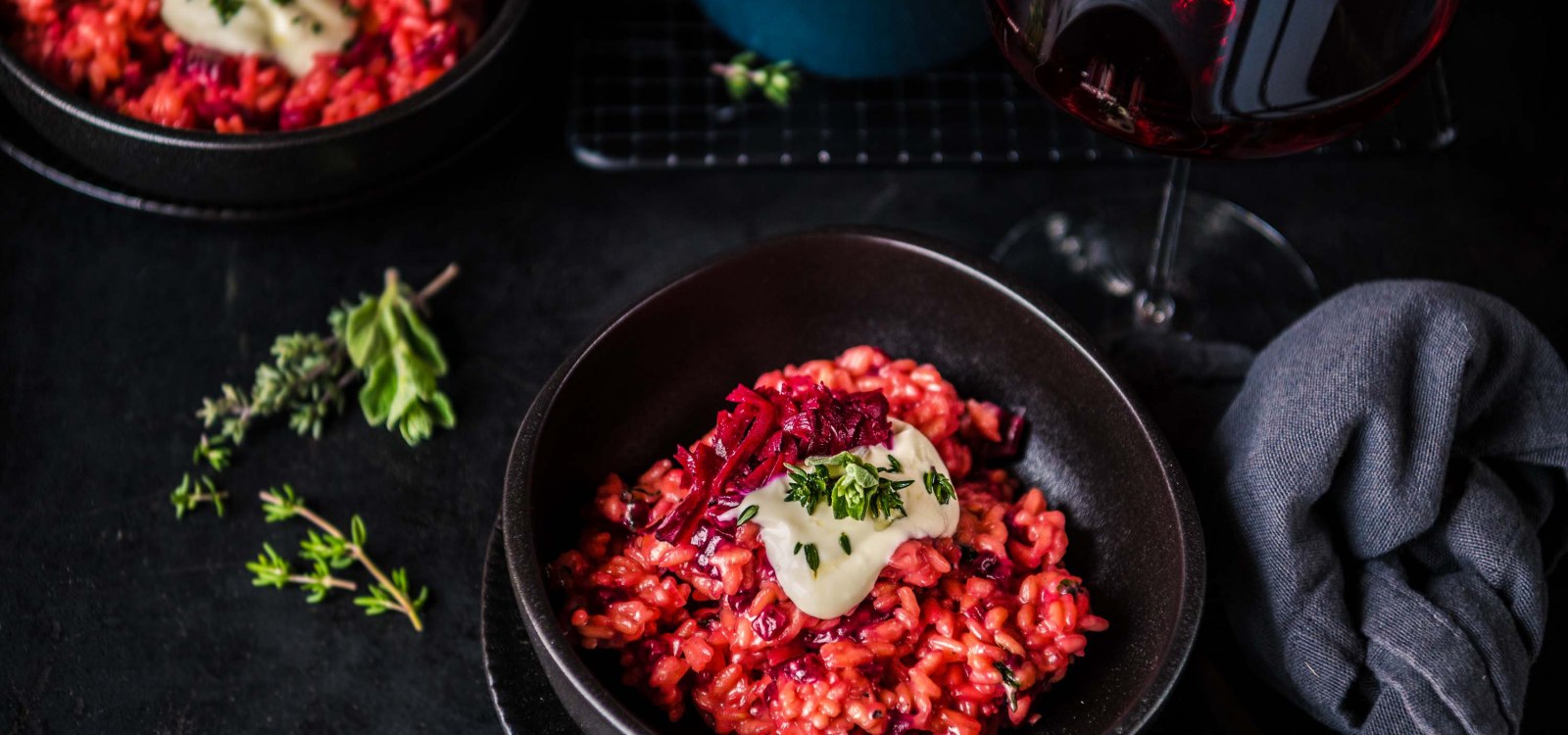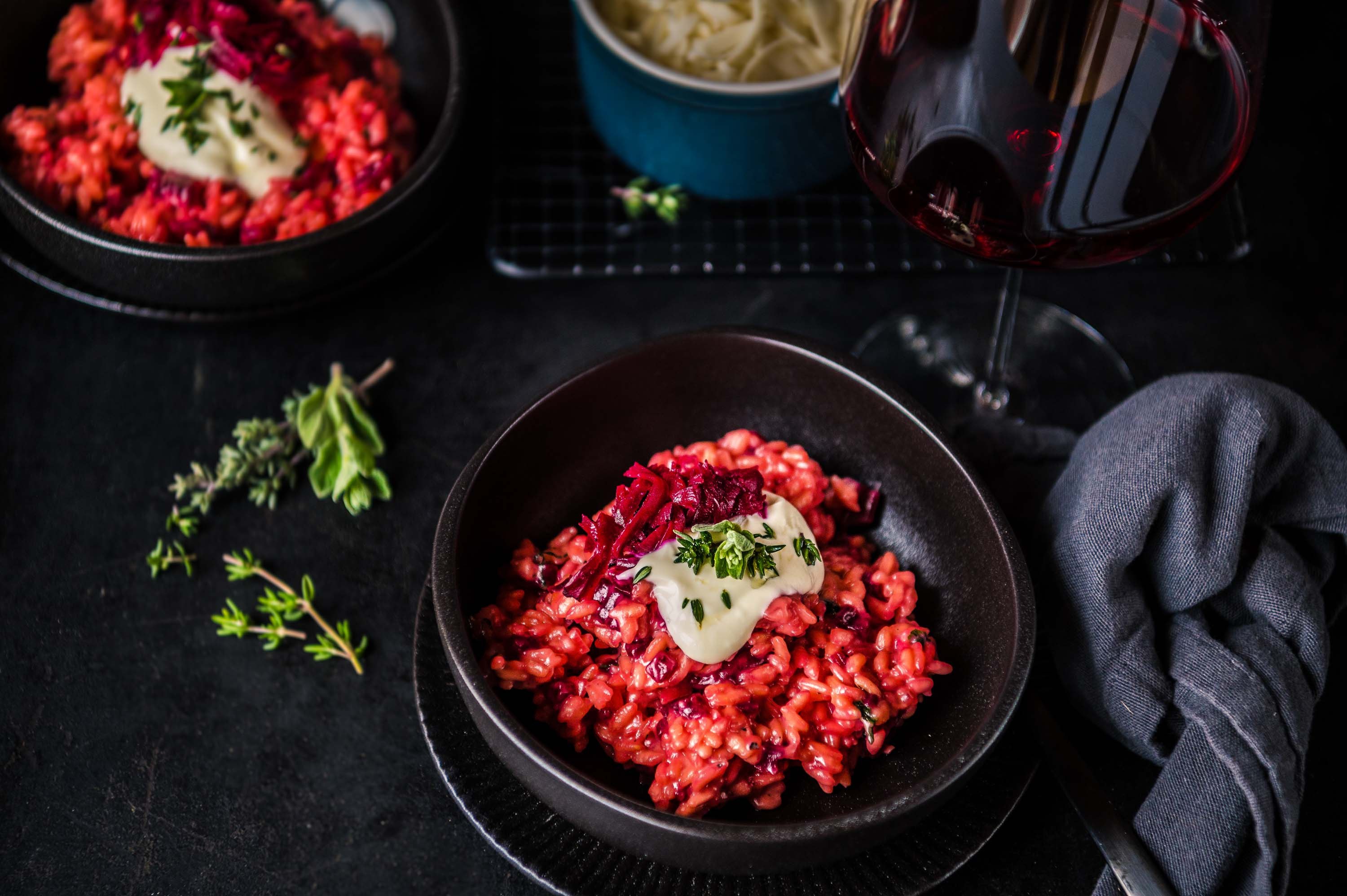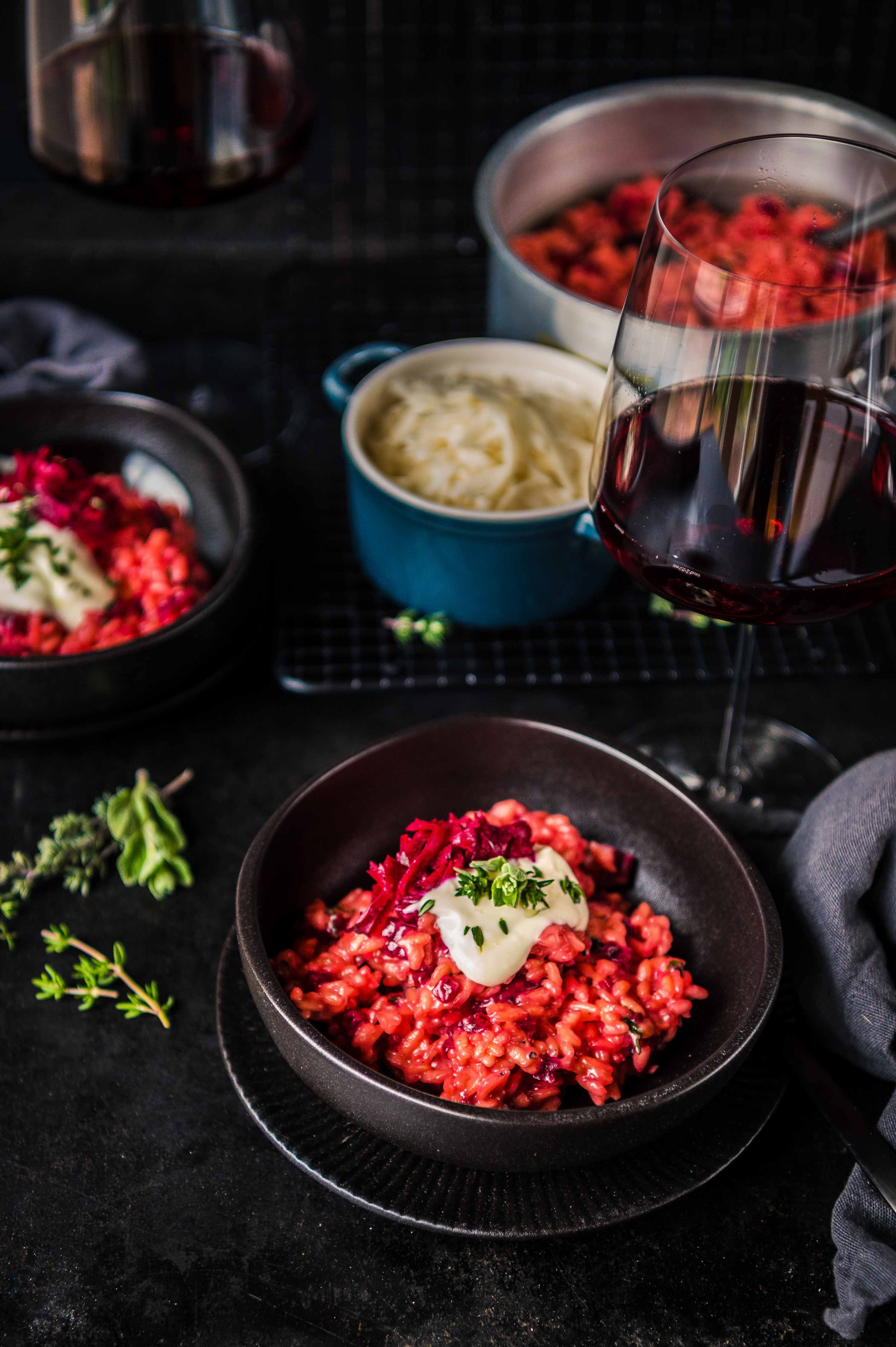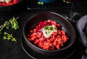 Wir färben das Risotto heute nicht nur mit Rote Bete Saft ein, es kommen auch kleine Rote Bete Würfel mit in das cremige Reisgericht. Ebenfalls verwenden wir keinen klassischen Rotwein zum Ablöschen, sondern bei uns kommt ein trockener Spätburgunder zum Einsatz. Der perfekte Gegenspieler zu den erdigen Noten der Roten Bete, welches in den Wintermonaten Hochsaison hat.