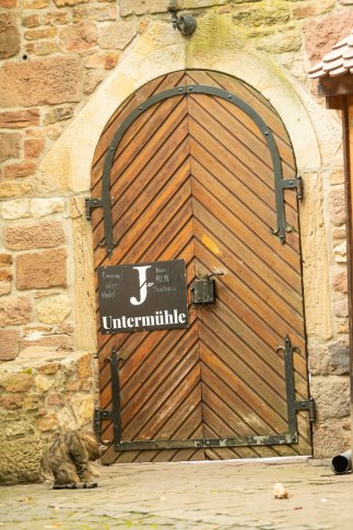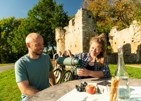 Wir starten in Ingelheim und lassen uns vom geschäftigen Zentrum locker stadtauswärts rollen. Ganz unerwartet stößt man hier auf Reste der mittelalterlichen Stadtmauer. Die hellen Sandsteine des Ohrenbrücker Tores machen Lust auf einen Abstecher ins historische Ingelheim. Aber dafür sollte man sich unbedingt einen eigenen Tag Zeit nehmen. Jetzt heißt es erstmal abtauchen in die Landschaft. Die satten Weinberge des Westerbergs mit dem Bismarckturm, der wie eine Krone obenauf sitzt, wechseln sich ab mit Obstfeldern und Pferdekoppeln. Das bringt einen jetzt schon ins Schwärmen. Wenige Kilometer später taucht das herrschaftliche Schloss Westerhaus auf den Höhenzügen oberhalb der Eulenmühle auf – VdP-Weingut mit Vinothek. Kleiner Tipp für eine Wanderung am nächsten Tag: die Hiwwel-Tour Westerberg führt direkt hierher.