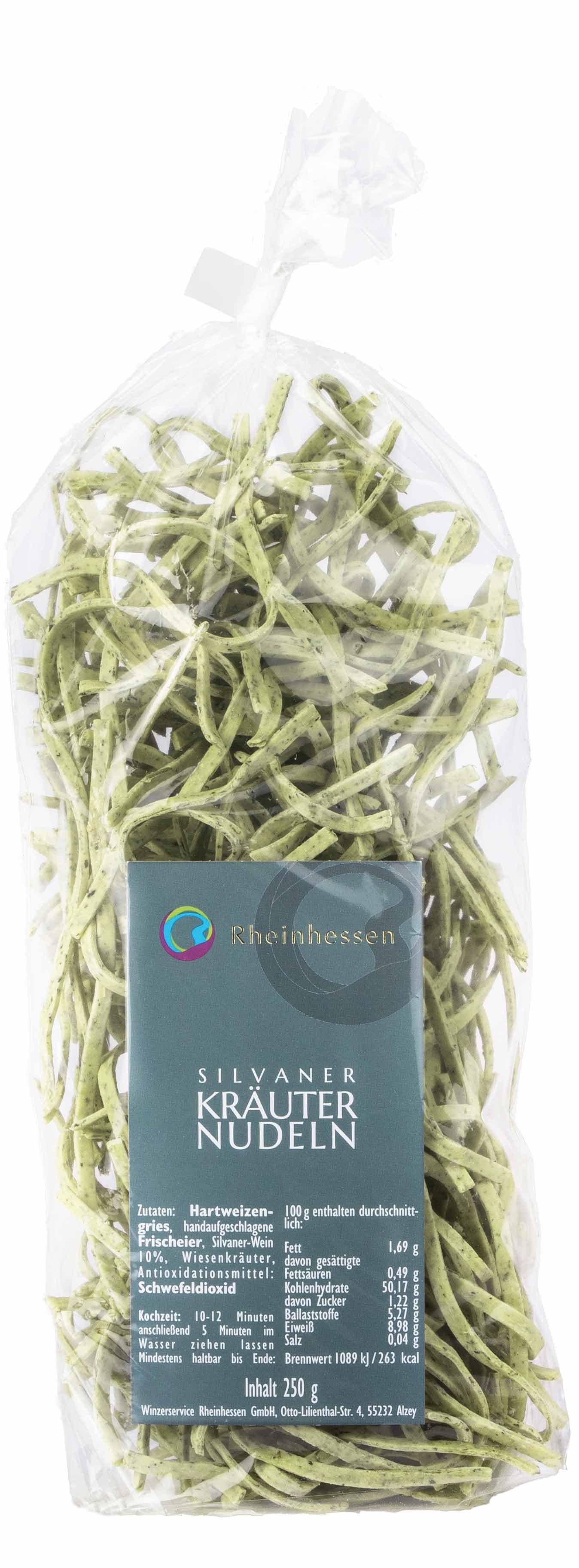 Beim Nudelrezept wurde ein Teil der Eier durch einen fruchtigen rheinhessischen Silvaner ersetzt. Und weil der Silvaner so gut zur Kräuterküche passt, wird der Teig mit getrockneten Kräutern, die auch in rheinhessischen Weinbergen und an Wegesrändern sprießen, verfeinert. Die Auswahl der Kräuter geht übrigens auf einen Ratschlag von Kräuterhexen aus Rheinhessen zurück: Dost, Brennnessel, Bärlauch, Löwenzahn, Petersilie, Schnittlauch und Dill geben den Nudeln einen kräftigen Geschmack und verleihen ihnen einen herzhaften Biss.