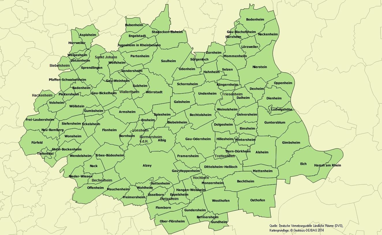 Das Förderangebot der Lokalen Aktionsgruppe (LAG) Rheinhessen ist einfach und steht Vereinen, Interessensverbänden, gemeinnützigen Organisationen oder Zusammenschlüssen von Einzelpersonen in den folgenden Ortsgemeinden zur Verfügung: Stadt Alzey, den Verbandsgemeinden Alzey-Land, Eich, Wöllstein, Wonnegau, Wörrstadt, Bodenheim, Rhein-Selz vollständig und Teilen der Verbandsgemeinden Gau-Algesheim, Nieder-Olm, Sprendlingen-Gensingen und Bad Kreuznach.