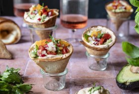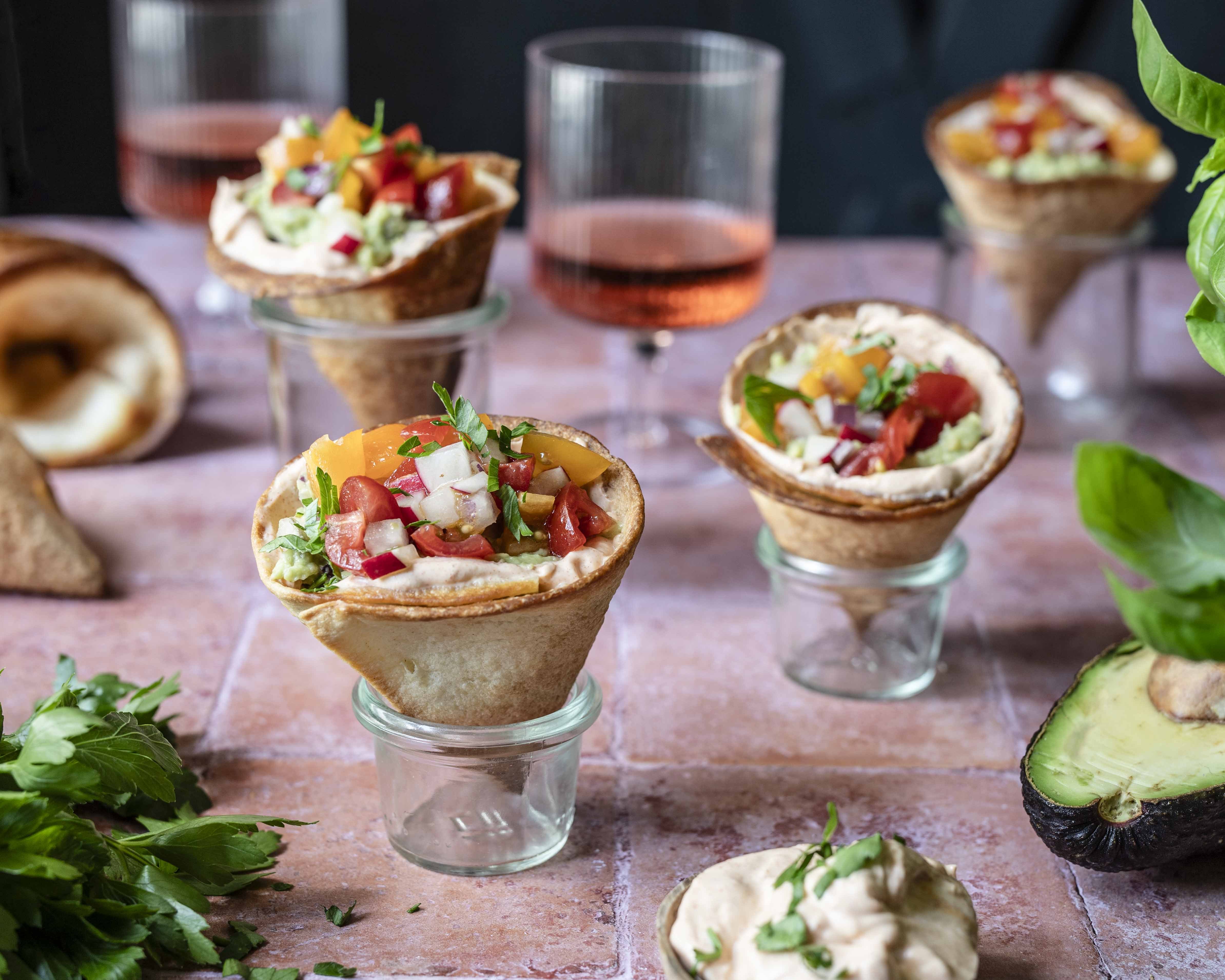 Die Tortillas halbieren. Jede Hälfte zu einem Cone aufrollen. Die Naht durch einen Zahnstocher befestigen. Die Cones von außen mit Olivenöl einpinseln. Bei 180°C für 12 – 15 Min. kross backen.