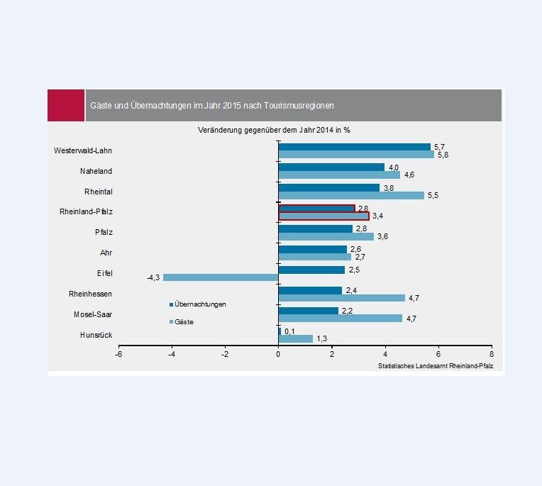 Die Entwicklung der Gästezahlen in Rheinhessen weist seit Jahren konstant nach oben. Auch im vergangenen Jahr ist der positive Trend ungebrochen: die Gästezahlen liegen mit950.965 um 4,7% höher als im Vorjahr und übertreffen den Landesdurchschnitt. Die Zahl der der Übernachtungen stieg um 2,4% auf 1.538.274 (Quelle: Statistisches Landesamt, Statistische Berichte).