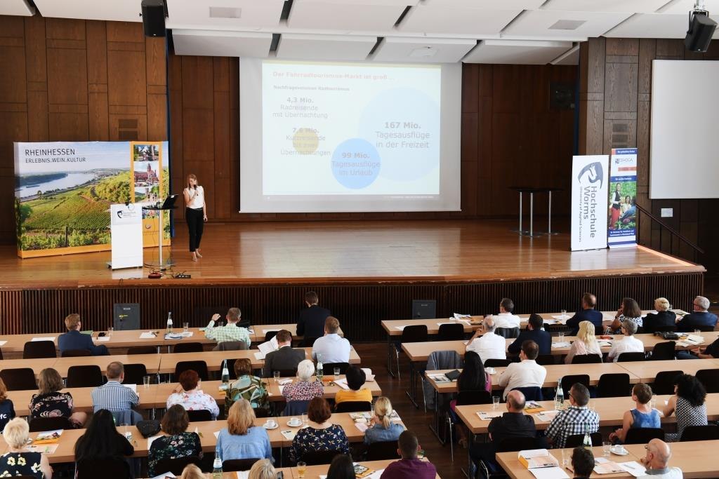 Mit der Umsetzung des Leitprojektes „Neuausrichtung Radtourismus“ der Tourismusstrategie Rheinhessen 2025 will die Region neue starke Impulse für eine nachhaltige Tourismusentwicklung setzen. Basis dafür ist der „Radtouristische Entwicklungsplan“, der im Rahmen des Tourismustags vorgestellt wurde. Silke Heck von BTE Tourismus- und Regionalberatung gelang es in ihrem Vortrag, die umfangreichen Analysen des Planungsbüros zur Ist-Situation der Radwege in Rheinhessen kurz und prägnant auf den Punkt zu bringen: Es gibt Handlungsbedarf, will man als Radregion wettbewerbsfähig werden und bleiben. „Nur wenn die Qualität des Angebots stimmt, kommt der Erfolg“, ist sich Christian Halbig, Geschäftsführer der Rheinhessen-Touristik sicher. „Nicht ohne Grund ist die Neuausrichtung des Radtourismus eines der sieben Leitprojekte der Regionalstrategie. Mit dem Radtouristische Entwicklungsplan haben wir eine gute Grundlage zur Bewertung und Optimierung unserer Infrastruktur. Daher ist es uns ganz wichtig, dass unsere kommunalen Partner sowie die vielen Leistungsträger den Tourismustag nutzen, um sich zu informieren, sich untereinander abzustimmen und sich zum gemeinsamen Ziel bekennen, die Wertschöpfung aus dem Tourismus noch zu steigern.“