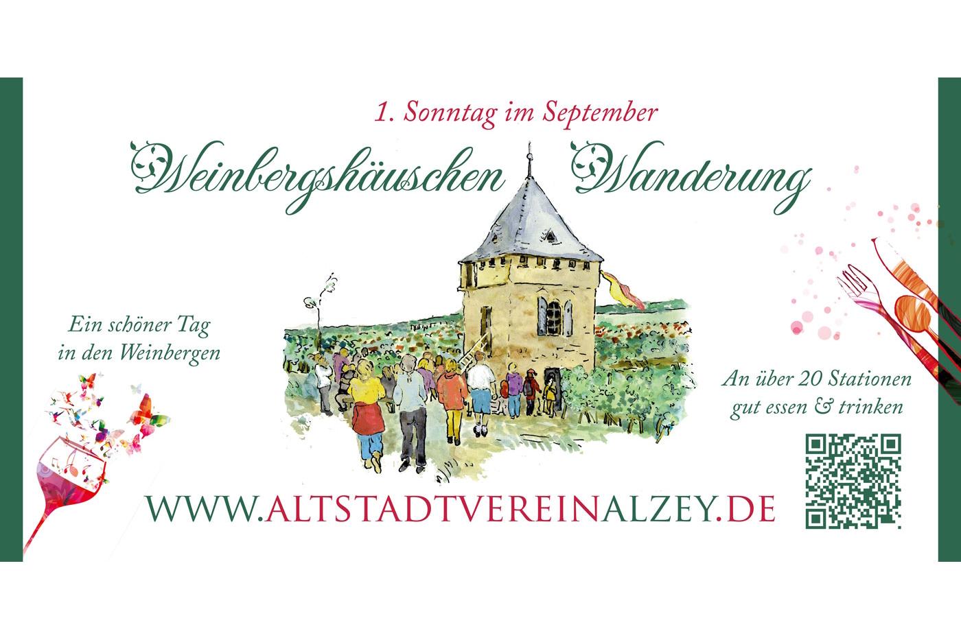 Bei dieser ältesten rheinhessischen Weinbergshäuschen-Wanderung werden an 24 historischen und neu gebauten Wingertshäusern von Mitgliedern des Altstadtvereins Alzey und heimischen Winzern verschiedenste Spezialitäten und hervorragende Weine aus der Region angeboten. Darüber hinaus können bei der Wanderung die vom Altstadtverein gestifteten Objekte des „Alzeyer Kunst- und Kulturwanderweges“ betrachtet und auch bei schönem Wetter von den Höhen der malerischen rheinhessischen Hügellandschaft Ausblicke bis zum Donnersberg, dem Taunus, dem Odenwald und zur Haardt genossen werden. Den Besuchern steht zwischen Alzey und den Vororten Heimersheim und Weinheim eine Wanderstrecke von etwa 20 km zur Verfügung. Jeder kann aber seine Wanderung (auch über Seitenwege) individuell gestalten und rasten, wo es ihm gefällt. Eine kulinarische Speisekarte lädt nicht nur zum Essen und Trinken ein, sondern gibt auch Hinweise auf musikalische Darbietungen und kleine Ausstellungen.