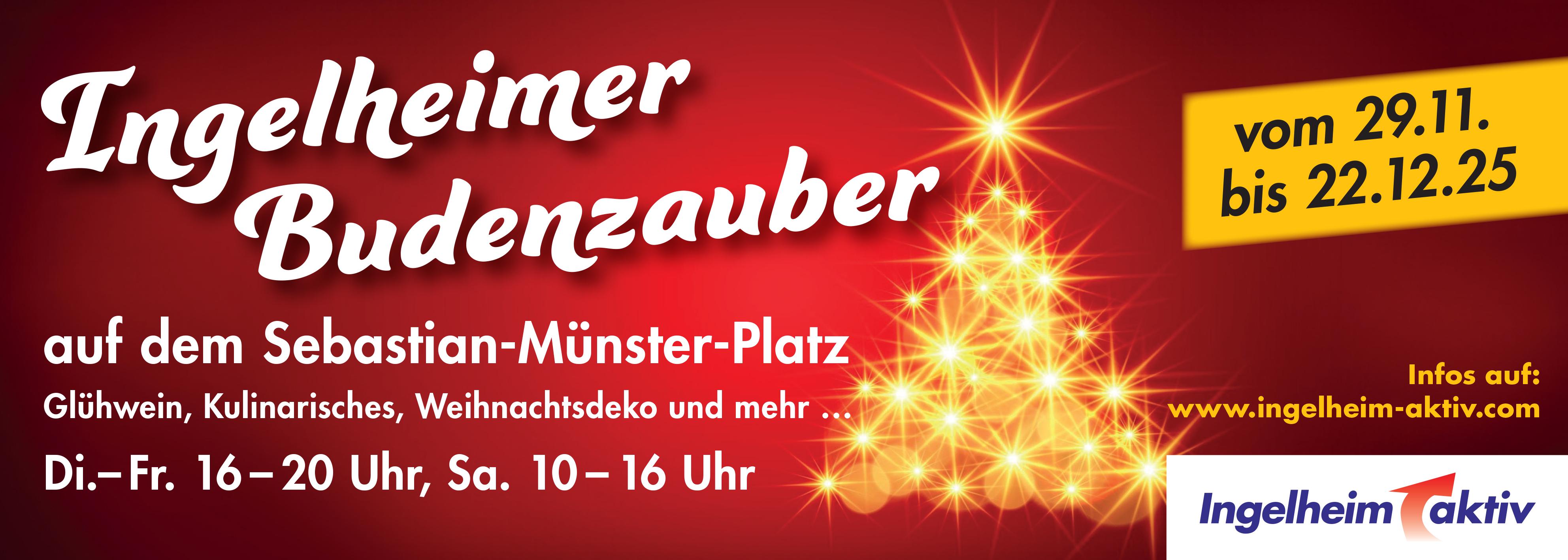 Ab dem 29. November wird der "Ingelheimer Budenzauber" die Innenstadt für gut 4 Wochen verzaubern. Neben dem traditionellen Weihnachtsbaum und der weihnachtlichen Beleuchtung der Stadt Ingelheim, werden auf dem Sebastian-Münster-Platz in festlichen Buden Glühwein und Leckeres angeboten und bis zum 22.12. ein Treffpunkt für Freunde, Vereine und Firmen sein. Organisiert wird der Ingelheimer Budenzauber, der in diesem Jahr seine Premiere feiert, von dem Gewerbeverein Ingelheim aktiv. Ingelheim aktiv möchte damit die Gäste anregen, in der vorweihnachtlichen Zeit die Innenstadt zu besuchen und dort bei einem Glühwein mit Freunden zu verweilen.
