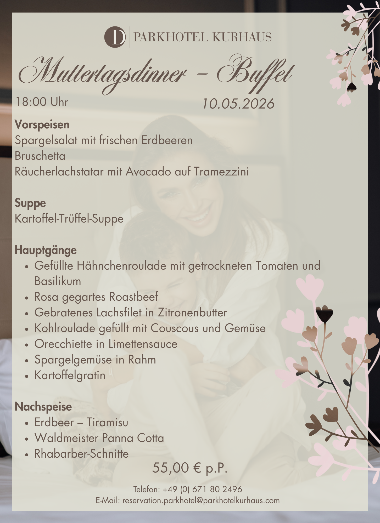 Am Abend erwartet Sie ein festliches Muttertags-Dinnerbuffet, das den Tag genussvoll ausklingen lässt.