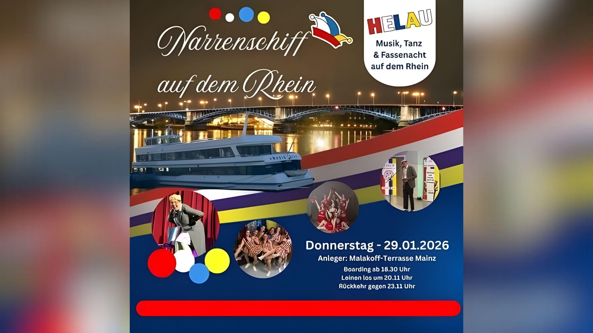 Wenn sich am Donnerstag, 29. Januar 2026, um 20 Uhr - Boarding ab 18.30 Uhr- an der Malakoff-Terrasse in Mainz die Leinen lösen, heißt es wieder: „Volle Fahrt voraus – die Fassenacht schläft heut Wellen!“ Gemeinsam mit der Rössler-Schifffahrtslinie heißt es: ab ins närrische Vergnügen, rauf aufs Narrenschiff und mittenrein in die Meenzer Fassenacht!