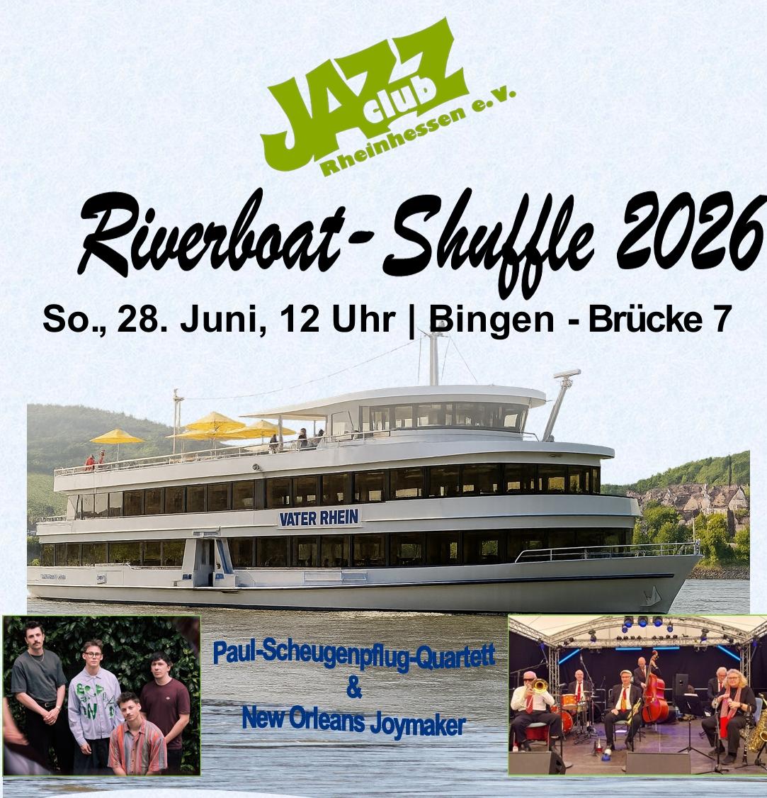 Der Jazzclub Rheinhessen e.V. veranstaltet am 28.06.2026 einen Riverboat-Shuffle. Los geht's um 12 Uhr in Bingen - Brücke 7.