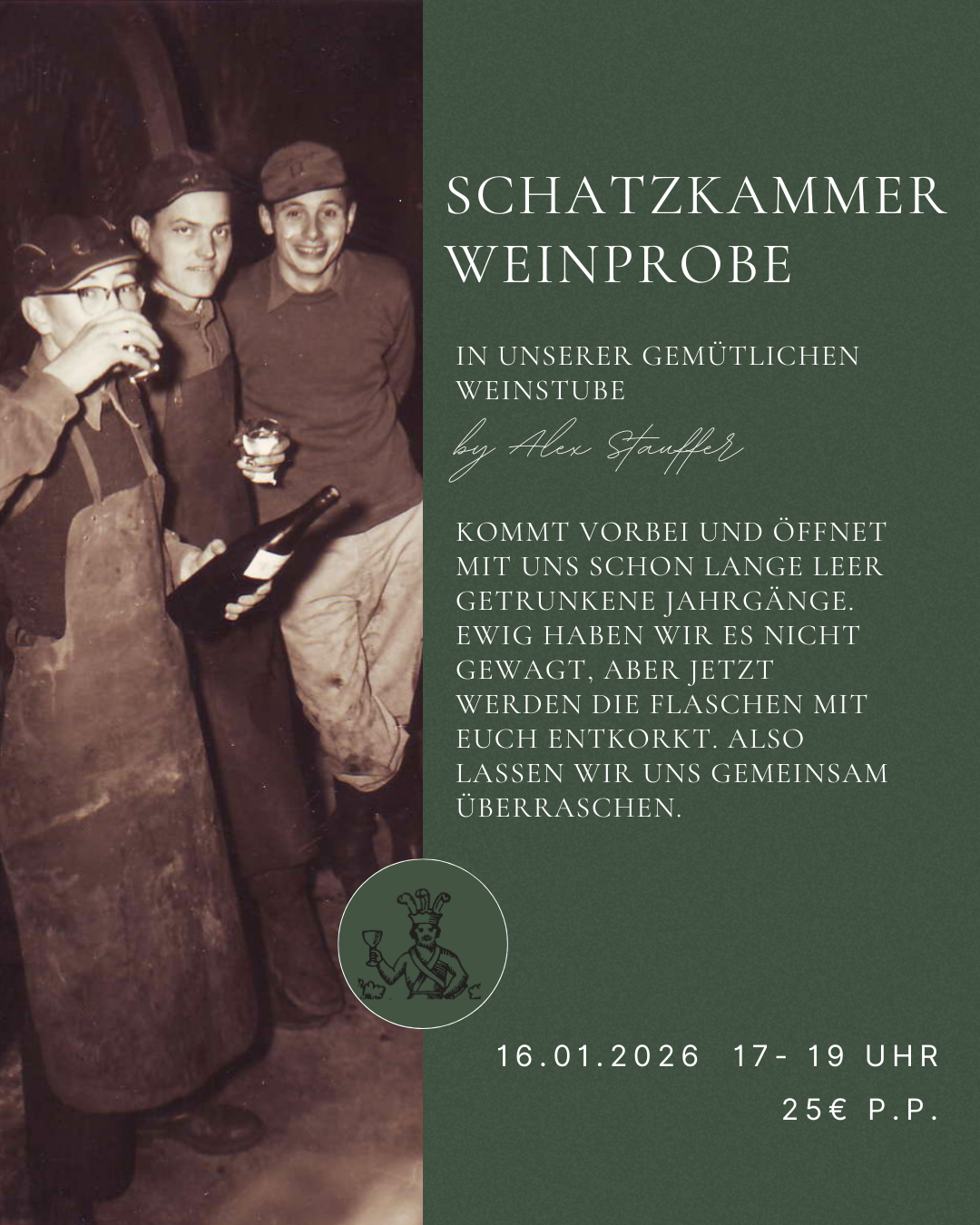 Kommt vorbei und öffnet mit uns schon lange leer getrunkene Jahrgänge. Lange haben wir es nicht gewagt aber jetzt entkorken wir die Flaschen aus unserer Schatzkammer mit euch, also lassen wir uns gemeinsam überraschen. Voranmeldung nötig. Datum: 16.01.2026 Uhrzeit: 17- 19 Uhr Kosten: 25€ P.p.