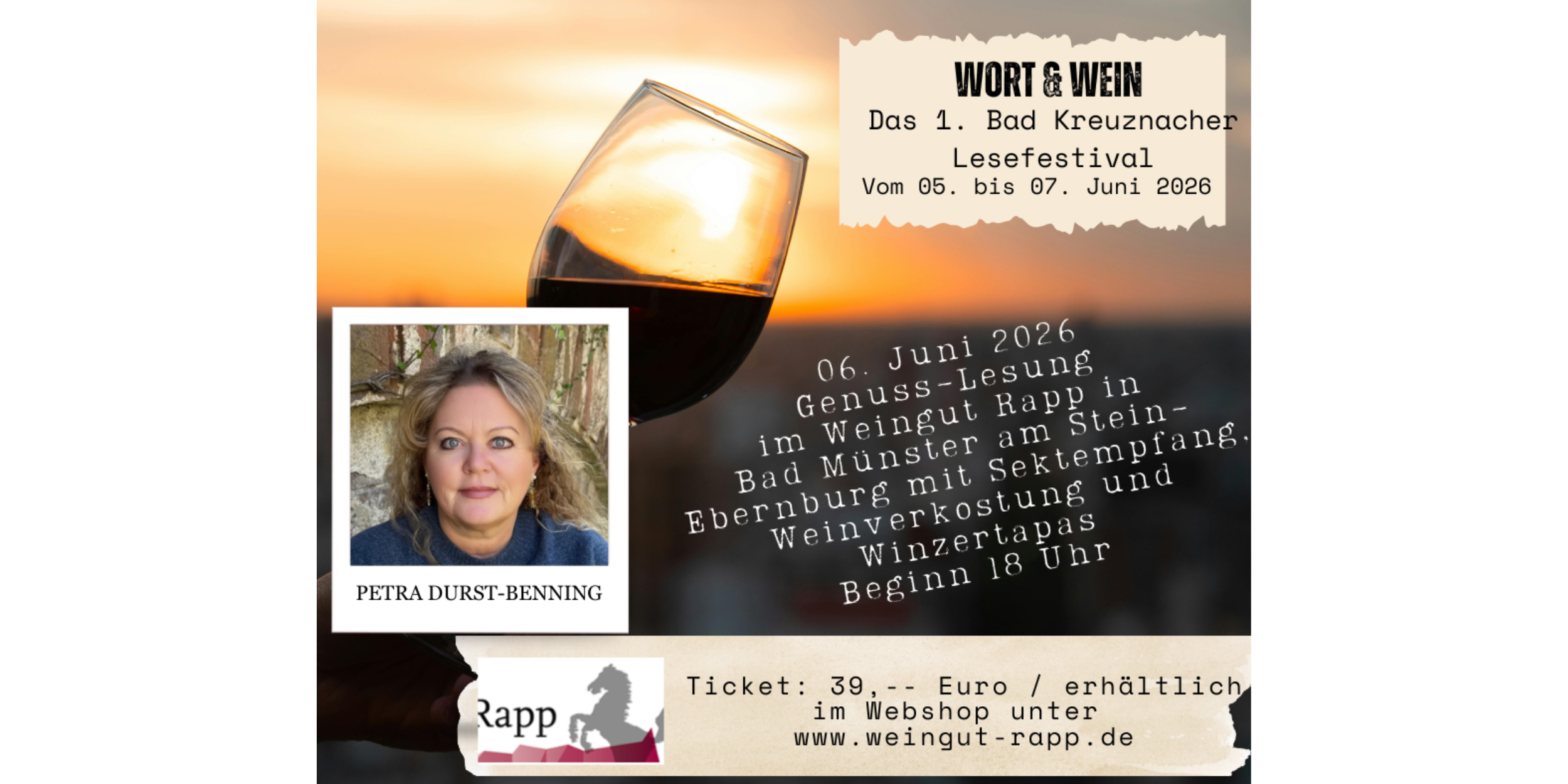 Genuss Lesung mit Sektempfang, Weinprobe und Winzertapas im Weingut RappWort & Wein, das 1. Kreuznacher Lesefestivalam 06.06. liest Petra Durst-Benning im Weingut Rapp aus Ihrem neuen Roman "Heimatsommer"Ticket: 39,00€ im Webshop unter www.weingut-rapp.de erhältlich
