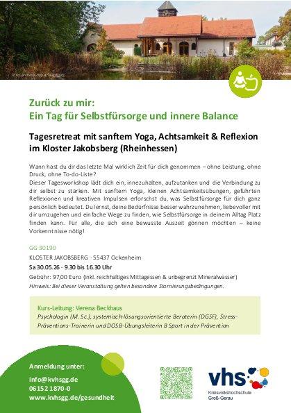 Dieser Tagesworkshop lädt dich ein, innezuhalten, aufzutanken und die Verbindung zu dir selbst zu stärken. Mit sanftem Yoga, kleinen Achtsamkeitsübungen, geführten Reflexionen und kreativen Impulsen erforschst du, was Selbstfürsorge für dich ganz persönlich bedeutet. Du lernst, deine Bedürfnisse besser wahrzunehmen, liebevoller mit dir umzugehen und einfache Wege zu finden, wie Selbstfürsorge in deinen Alltag Platz finden kann.