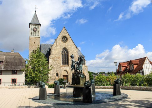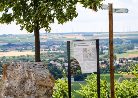 Der Brunnen ist zur Freude spielender Kinder ebenerdig und begehbar. Und – soviel schon vorab – auch wir werden uns am Ende unserer Wanderung über die kleine Abkühlung für unsere müden Füße freuen. Zunächst aber nehmen wir den Zuweg zur Hiwweltour und freuen uns auf knapp sieben Kilometer abwechslungsreichen Wanderweg. Die Hiwweltour Zornheimer Berg ist übrigens die kürzeste der rheinhessischen Hiwweltouren.