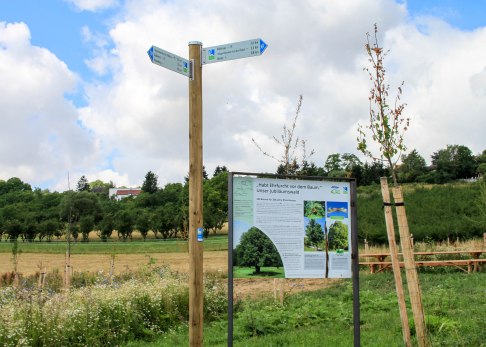 Woher wir so viel über diesen Jubiläumswald wissen? Insgesamt zehn äußerst kurzweilige Infotafeln begleiten unsere Wanderung und informieren uns über Besonderheiten am Wanderweg. Zudem verraten sie fleißig, wie viel Wegstrecke schon hinter uns liegt und wie viele Kilometer wir noch vor uns haben. Ein toller Ansporn!