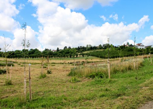 Der erste sprichwörtliche Höhepunkt dieser Hiwweltour ist der Hasenberg. Wir genießen tolle Ausblicke vom „Hiwwel“ (Hügel) in den Taunus und erreichen wenig später den rheinhessischen Jubiläumswald. Na gut, von einem Wald kann man noch nicht wirklich sprechen, schließlich wurden die 200 Bäume erst 2016 anlässlich des 200-jährigen Jubiläums von Rheinhessen gepflanzt.