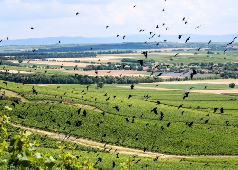 Den letzten Rückanstieg versüßen wir uns schließlich mit einer Rast am Wingertshäuschen „Am Hohberg“. Während wir es uns auf der Bank in der Sonne gemütlich machen, schrecken immer wieder Starenschwärme aus dem Weinberg in den Himmel. Ein beeindruckendes Bild – auch wenn die Vögel selbst die reinste Plage für die Winzer sind, denn sie haben es auf die leckeren reifen Trauben abgesehen. Nun wissen wir auch, für wen die kreativen Vogelscheuchen am Wegesrand gedacht sind.
