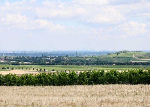 Sobald wir aber die Weinberge erreichen, kehrt Stille ein. Kein buntes Naturkonzert mehr, dafür ein Meer aus Reben, das nicht weniger beeindruckend ist. Schritt für Schritt erklimmen wir den nächsten Hiwwel und jede Anstrengung ist wie weggeblasen, als wir den Ausblick vom Wingert genießen. Das Wetter ist herrlich, die Sicht ist frei und so blicken wir nicht nur bis in den Taunus, wir können am Horizont sogar die Skyline von Frankfurt am Main ausmachen. Die Hochhäuser sind eindeutig zu erkennen. Was für ein toller Kontrast zwischen Stadt und Land, Zivilisation und Natur!