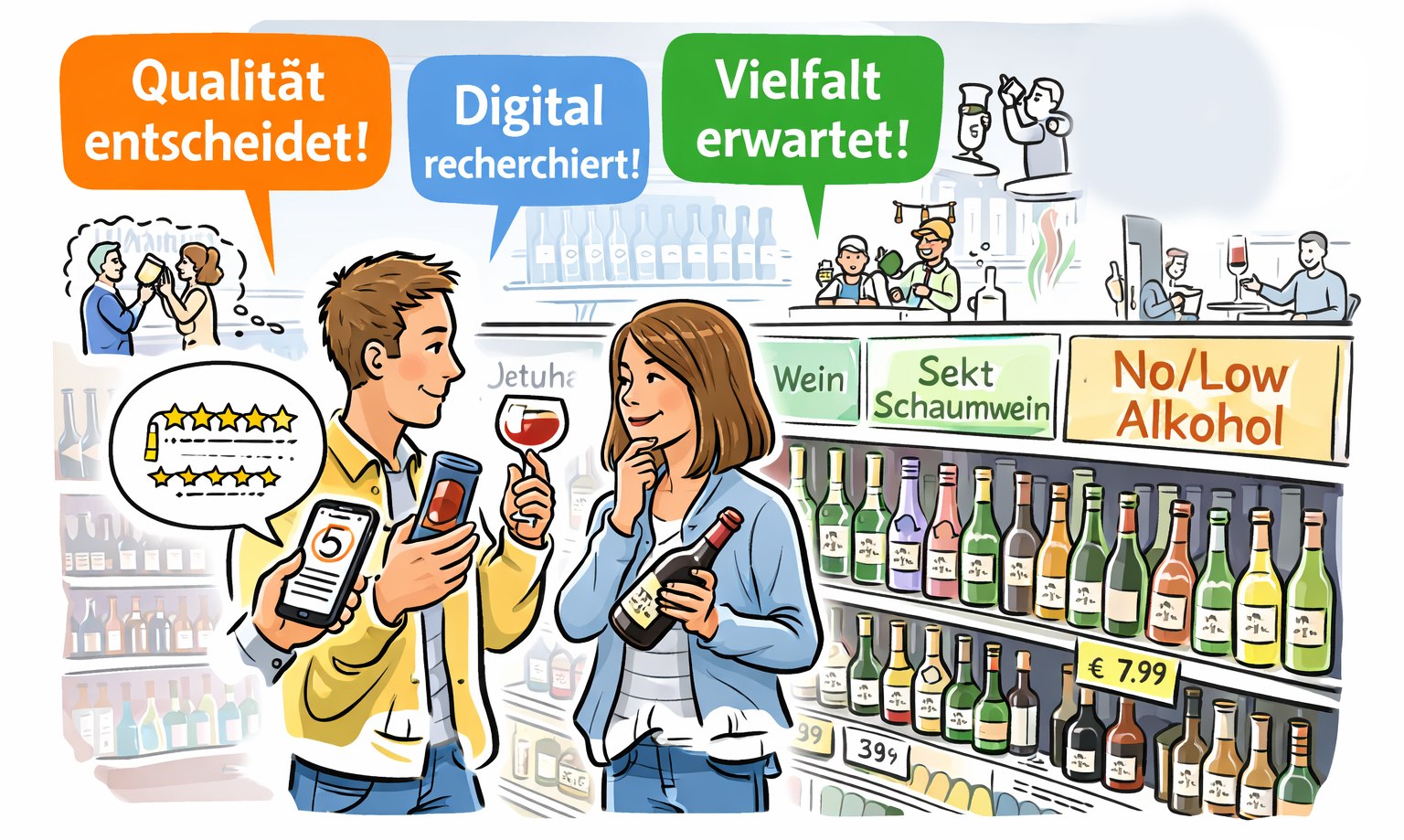 Der Wunsch nach No- und Low-Alkohol-Produkten wächst kontinuierlich – besonders bei jüngeren Zielgruppen. Außerdem wird Wein nicht mehr ausschließlich zu Feiertagen gekauft. Treffen mit Freunden, gutes Essen oder kleine Alltagsmomente sind heute ebenso relevante Kaufanlässe.