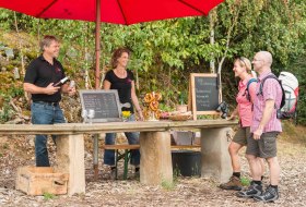 Unser Weingut liegt an der direkten Route der Hiwweltour Westerberg. Auf unserem Grundstück bieten wir ab sofort die Möglichkeit eine kurze Rast zu machen. Eine Sitzgruppe lädt dazu ein, den Ausblick auf den Westerberg sowie die umliegenden Schwabenheimer Weinlagen zu genießen. In einem alten Holzfass befindet sich ein Kühlschrank, aus dem zu erschwinglichen Preisen Wein, Wasser und Traubensaft angeboten wird. Des Weiteren besteht die Möglichkeit zur Toilettenbenutzung in unserem Weingut. Auf Anfrage können…