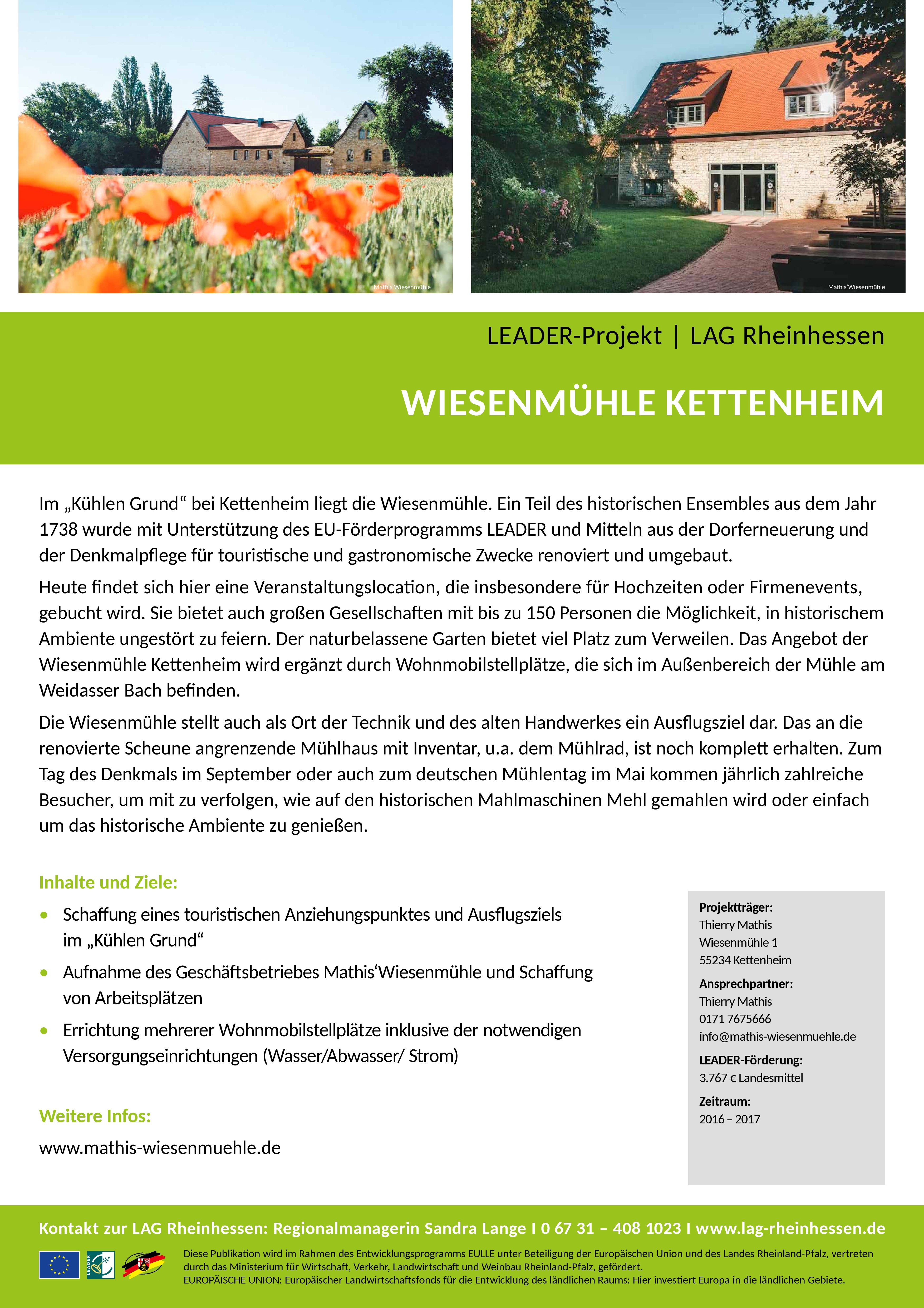 Im „Kühlen Grund“ bei Kettenheim liegt die Wiesenmühle. Ein Teil des historischen Ensembles aus dem Jahr 1738 wurde mit Unterstützung des EU-Förderprogramms LEADER und Mitteln aus der Dorferneuerung und der Denkmalpflege für touristische und gastronomische Zwecke renoviert und umgebaut.