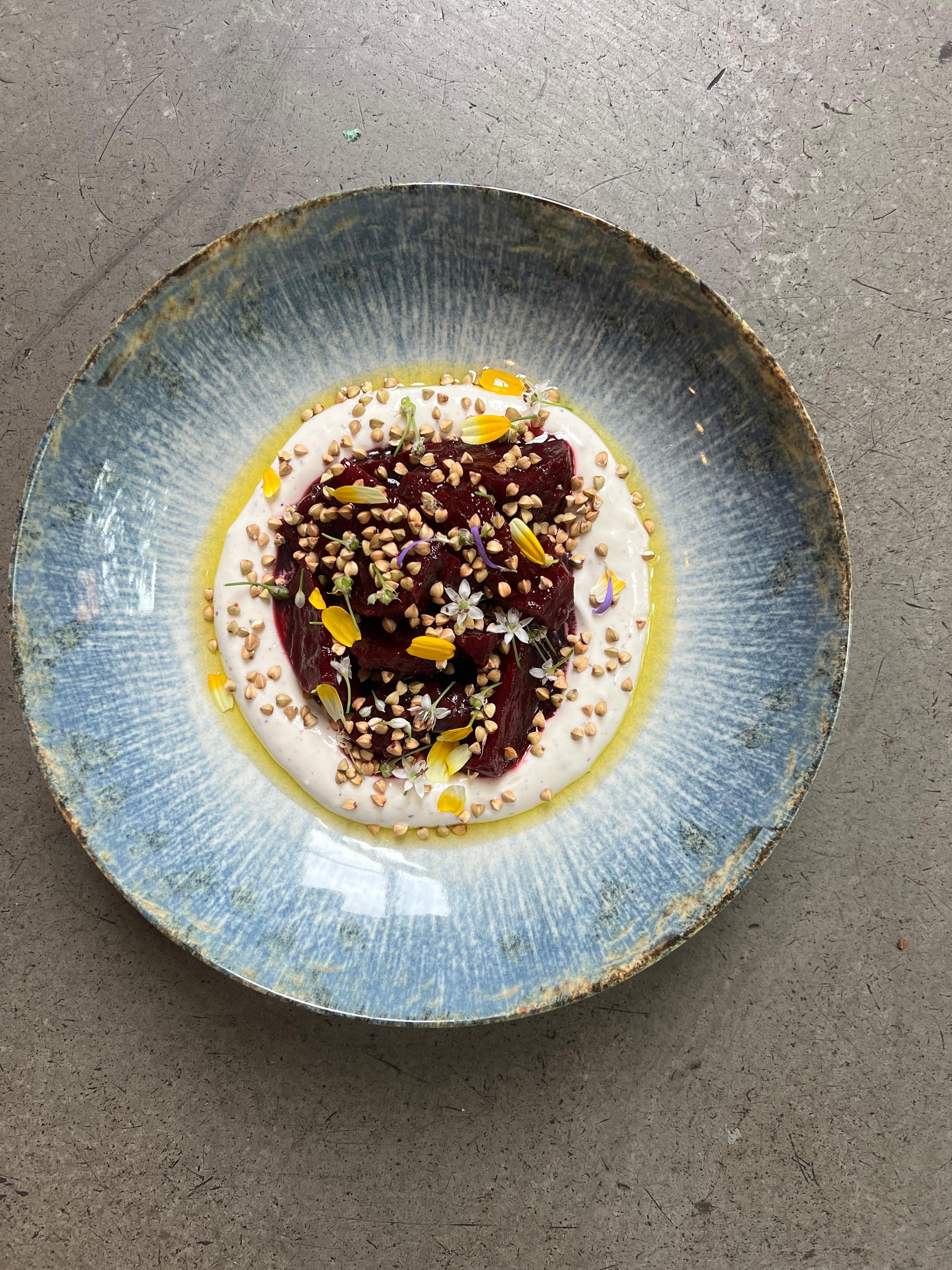 Aktionsgericht: Ofengebackene Rote Bete mit Sauerkirschen-Marinade, Wacholder Crème fraîche & Wildkräuteröll